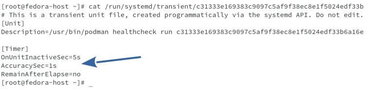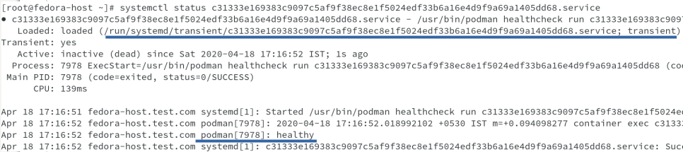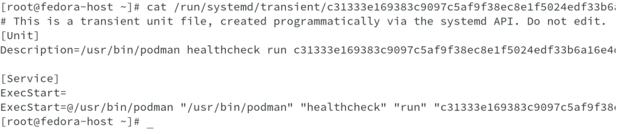 The above output clearly shows that, podman uses systemd and it sets up a transient systemd service and timer ( Transient unit files are created dynamically with the runtime API. Transient units may not be enabled.). The .service file defines the healthcheck command and .timer is for scheduling of the healthcheck.