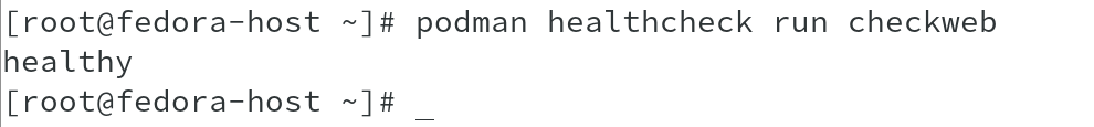 Running podman healthcheck command with container name as argument shows the container health status, which in this case shows Healthy.