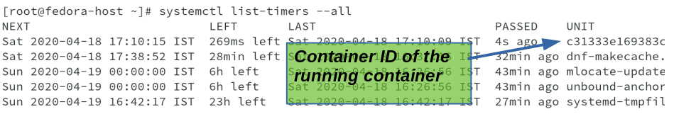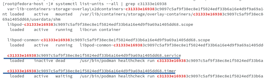Let us first start by checking the systemd timer to check the timer which has been created for the podman healthcheck scheduling. The unit corresponds to the container ID which was created by podman run command.