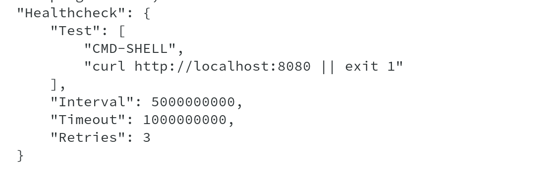 Healthcheck comprises of setting a healthcheck command to run inside the container, interval for healthchecks, number of retries allowed before healthcheck is considered unhealthy, start period, the initialization time needed for a container to bootstrap and a timeout period which defines maximum time allowed to complete the healthcheck.