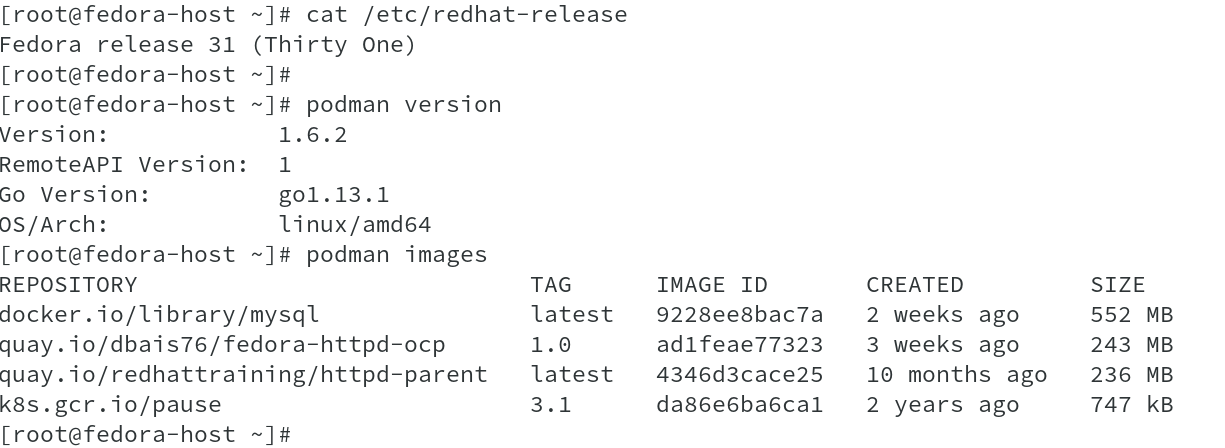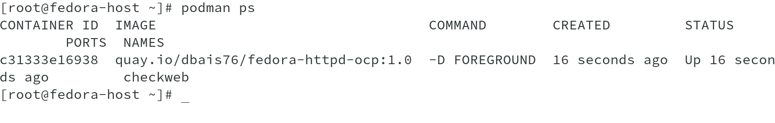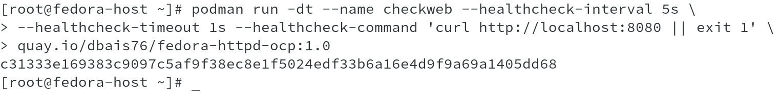 To perform healthcheck test, I am using a fedora 31 host with podman version 1.6.2 installed on it. The image used is a custom image of httpd running on port 8080 ( Ref: quay.io/dbais76/fedora-httpd-ocp:1.0 ).