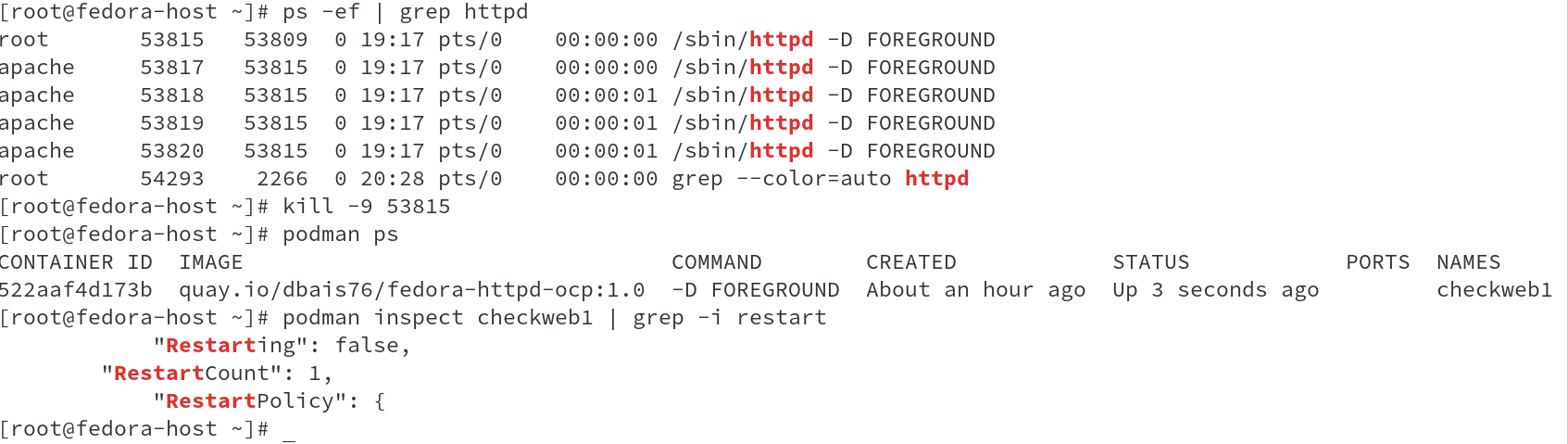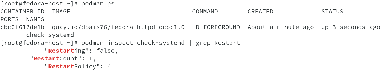 The output of podman inspect this time shows that Restart count has now incremented to 1 and the container is in Running state. As we have set the Maximum retry count to two, the container got restarted. I killed the container parent process again by repeating the previous process, which now make our restart count to 2, the set threshold and getting the container process up again.