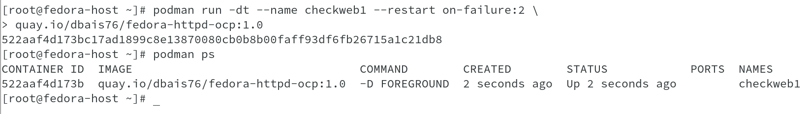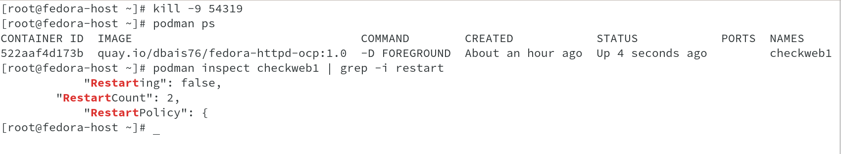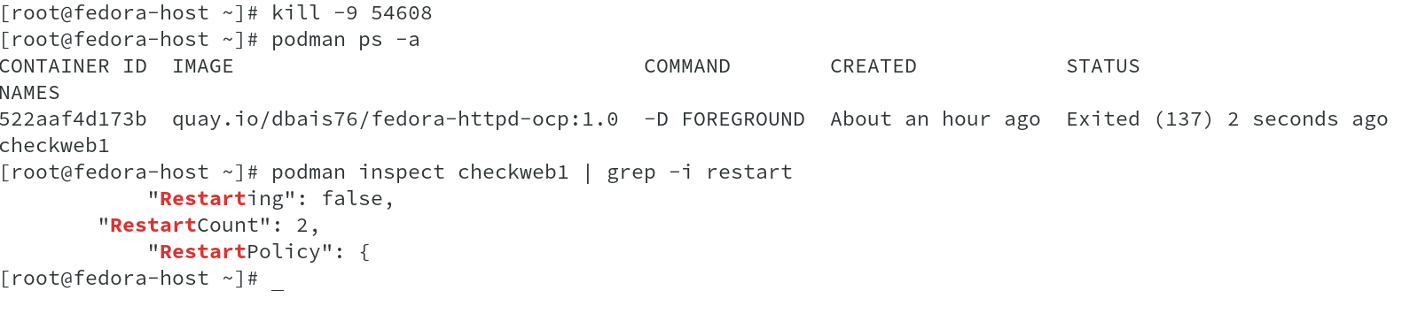 Running podman inspect checkweb1 shows us that as of now, Restart count is 0, as the container hasn’t restarted yet and also the Restart policy of on-failure with Maximum retry count of 2.