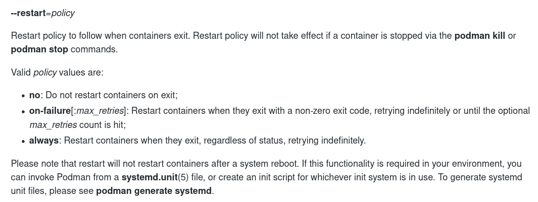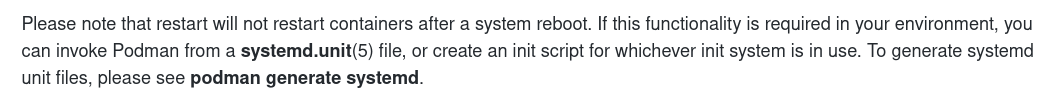 The important point to take note regarding restart policy is, Restart will not restart containers after a system reboot. If you need this functionality with your application, you need to use systemd unit with podman and generate systemd unit files.