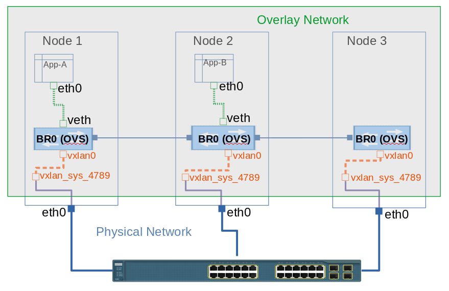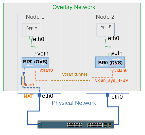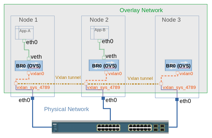 To understand it better, lets us follow the diagram above. The graphical representation shows that from Container App-A uses a VETH pair with one end connected to eth0 in container and the other end is connected to the Br0 port, which is an OVS bridge. Br0 forwards the traffic out using VxLAN tunnel created, vxlan0 interface being internal to OVS and vxlan_sys_4789 is external interface to host side. From there OVS flows are responsible to forward the packets to cluster nodes using VxLAN tunnel to remote host on which container App-B is deployed, which has similar infrastructure and virtual devices to receive the packets.