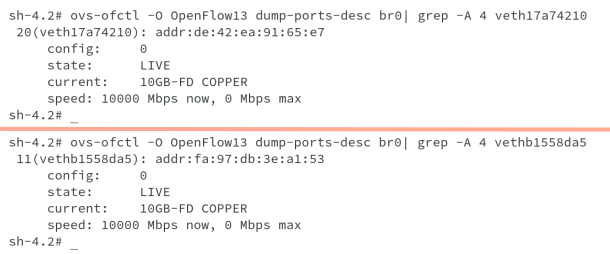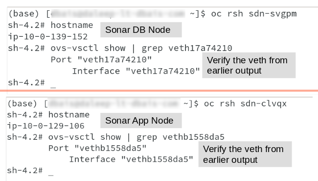 Once we do oc rsh , we are able to run ovs-vsctl show command to get the list of interfaces available on the hosts and we are able to see our vethXXXXX interfaces attached to it as well.