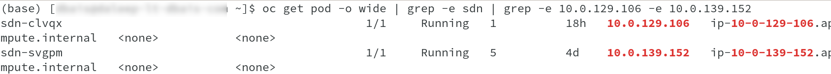 At this point, I need to get the sdn pods ip addresses running on the nodes on which our App and DB pods are deployed, so that we can connect to those pods and check for veth pairs connected to OVS for our containers.