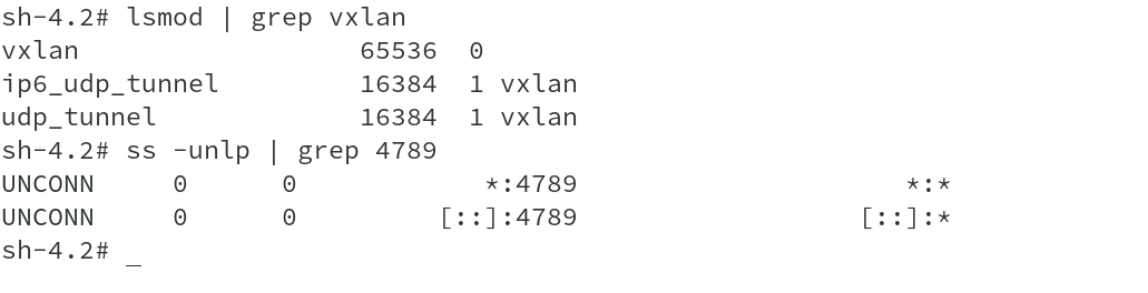 Now let us also see vxlan on the host and how it performs the forwarding for us. As discussed earlier, this interface is created by OVS directly in the Kernel and captures all the traffic (all the VNIs) on port 4789. Running a simple netstat command for UDP port 4789 shows us this information and checking for kernel modules loaded also shows vxlan being loaded.