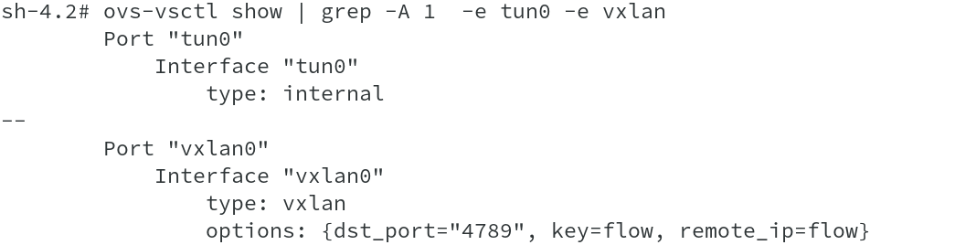 Also running ip address command on the host lists vxlan_sys_4789 interface and ovs-vsctl on SDN pod shows vxlan0 interface which is internal to OVS.