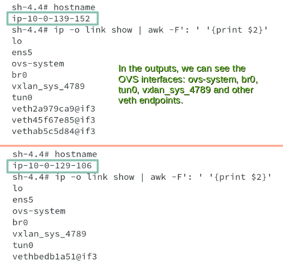 I am quickly connecting to both the nodes on which our applications pods are deployed to see the interfaces, we have discussed and the output shows all interfaces available as part of the OVS SDN. You can also see vxlan_sys_4789 on the host, which is part of vxlan traffic.
