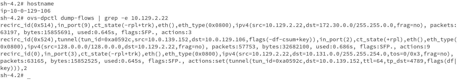 #ovs-ofctl -O OpenFlow13 dump-flows br0 | grep -e arp_spa=10.131.0.116 -e arp_tpa=10.131.0.116