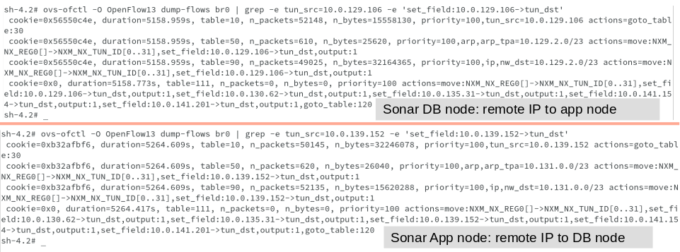 #ovs-ofctl -O OpenFlow13 dump-flows br0 | grep -e tun_src=10.0.129.106 -e 'set_field:10.0.129.106→tun_dst'