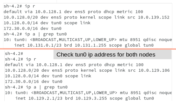 We have seen all the OVS interfaces except one, which is tun0. Tun0 is a port internal to OVS and it get the cluster subnet gateway address assigned for external access. SDN interacts with Netfilter to create routing rules for external network access through NAT.