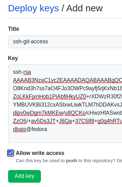 Open a text editor and copy the content of the public key and we need to put that in Deploy Keys in our Git repository. In your Git repository, click Settings, look for Deploy keys from the menu options on the left-hand side and click Deploy Keys. Paste the content of your public key to Deploy Keys and give a name to identify the key. This takes care of the Git for us and now we can move to connect from the local workstation to the repository.