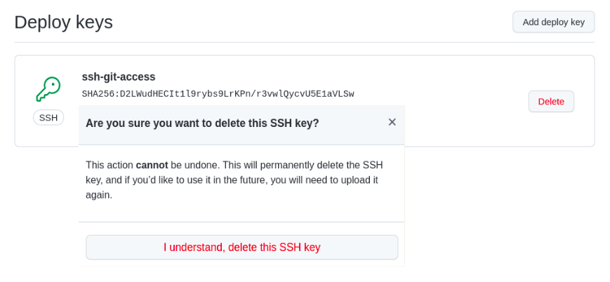 Now that we have seen how to add the keys and use them, we can also do a cleanup, i.e., removing the key from ssh-add and also if needed, delete the key from Github. Run command ssh-add -D to delete the keys from the local workstation and also verify by executing ssh-add -L. From github.com, under Deploy Keys, click Delete against the key you wish to delete and click <I understand, delete this SSH key> button to confirm the action.
