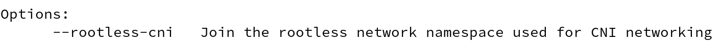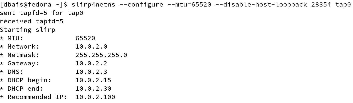 In this case, since, I am running as a non-privileged user, using the PID, on new terminal, let us use slirp4netns utility to configure the host network and simulate network access. ( Refer man slirp4netns for information on various options)