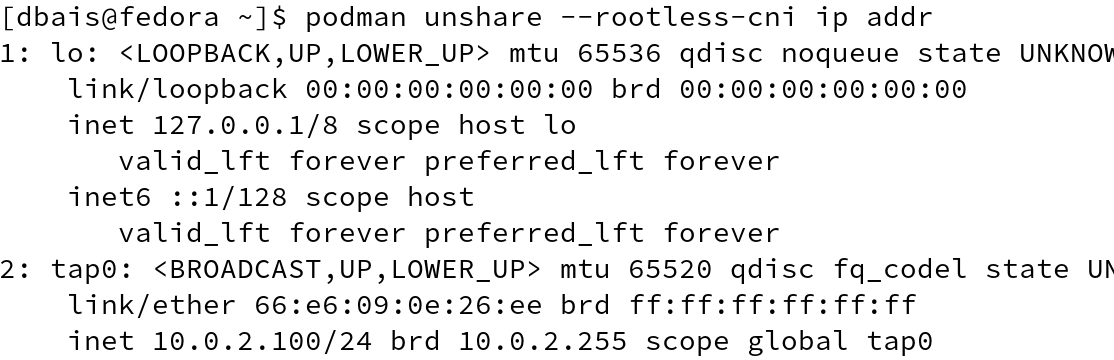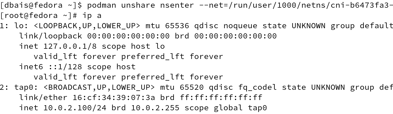 We can also use podman unshare command to connect to the network namespace using the sandbox key and observe, how Slirp helps us to get the network running.