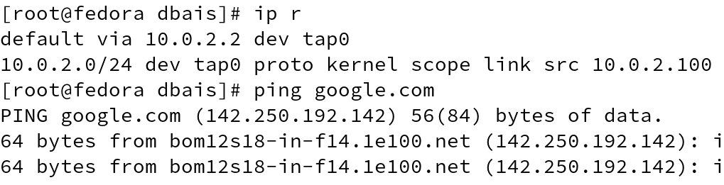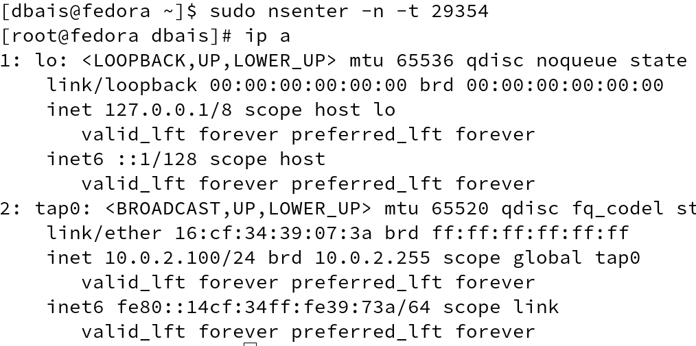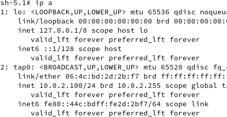 IP address will be set to 10.0.2.100 (network address + 100) by default. Now back to first terminal where, we displayed the list of network interfaces in our namespace, we will be able to see another interface tap0, which has been assigned an IP addess by slirp.