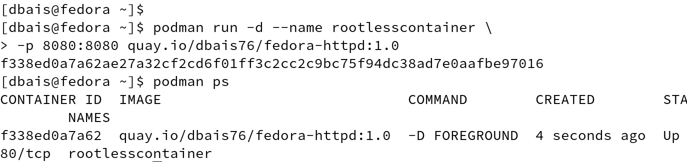 #podman run -d --name rootlesscontainer -p 8080:8080 quay.io/dbais76/fedora-httpd:1.0