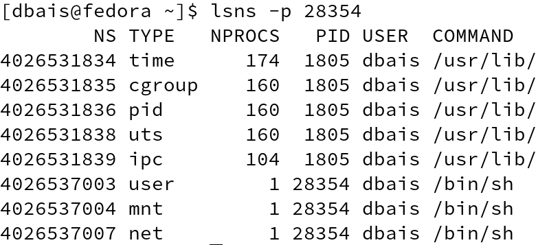 Using the command echo $$, we get the current PID of the process and using lsns -p , we can also get the namespace identifiers.
