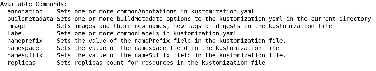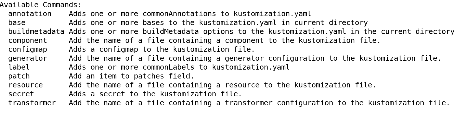 Of course, kustomize provides us several sub-commands to create and modify the kustomization for us. For example, run below command to find more sub-commands which would allow us to add various resources, labels, generators etc to kustomization.yaml file. The output would seem like the one shown below.