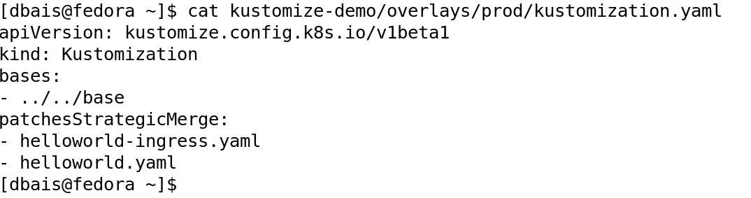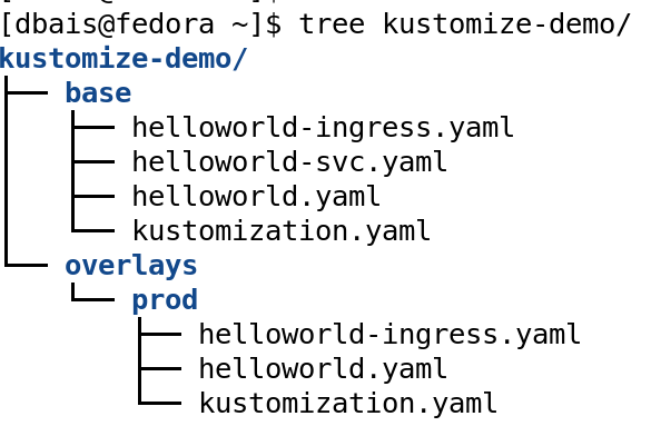 This can also be clearly understood from the below output which shows the tree structure of the demo folder consisting of base directory with its own kustomization.yaml and for now, only one overlay, which is prod with its own kustomization.yaml and resources to be modified in the Prod environment.