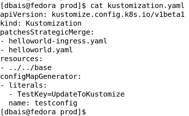 Let me quickly show an example to generate a configmap and add to the kustomization.yaml in my prod overlay. The first image shows the current state of the overlay kustomization.yaml.
